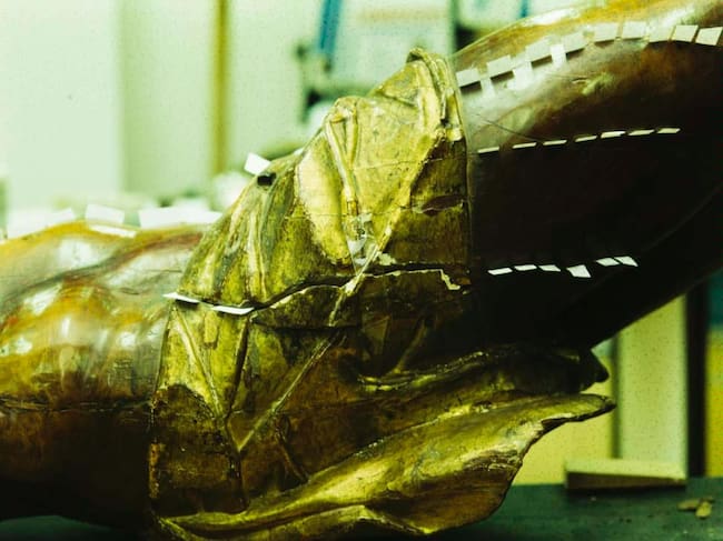 En paralelo, los elementos de plata —clavos, remates e INRI— fueron limpiados, enderezados, soldados cuando fue necesario y protegidos con barnices reversibles. El paño de pureza recibió una reintegración de preparación y oro fino en las zonas en riesgo de desprendimiento.