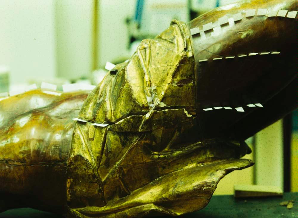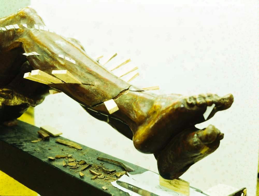 Uno de los trabajos más delicados fue la corrección estructural de las piernas: se eliminaron clavos antiguos, se limpiaron adhesivos degradados y se recolocaron las piezas con espigas de madera, devolviendo la alineación correcta. El mismo procedimiento se aplicó a las manos.