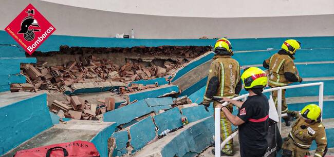 Los técnicos muncipales siguen inspeccionando la zona de las gradas que ha cedido en el pabellón Juan Carlos Verdú de Elda con el fin de identificar el motivo por el que, este sábado, se derrumbaron causando, afortunadamente, solo cuatro heridas leves.