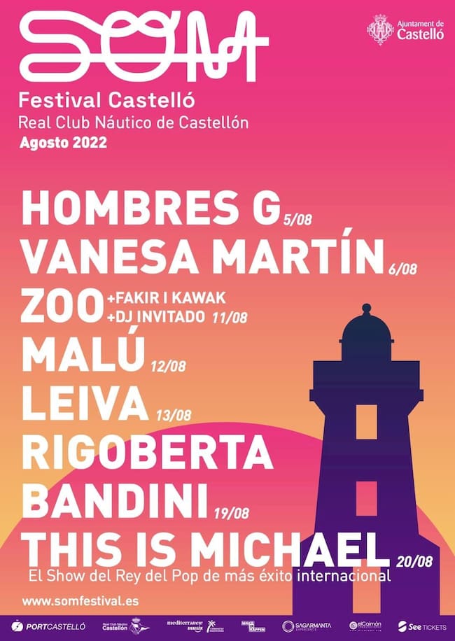 La segunda edición del SOM Festival Castelló presenta la programación de su próxima edición. Durante el mes de agosto, el escenario instalado en el varadero del Real Club Náutico de Castelló de la Plana acogerá las actuaciones de seis figuras destacadas del panorama musical estatal y valenciano: Hombres G; Vanessa Martín; Zoo; Malú; Leiva; y Rigoberta Bandini. Además, el público podrá disfrutar con el espectáculo This Is Michael, el celebrado tributo a Michael Jackson que ha recorrido Europa y América Latina.