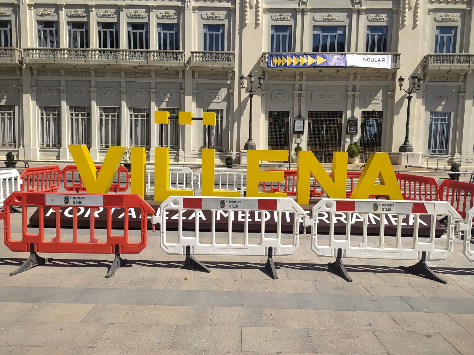 Se trata de la palabra “Villena” en grandes letras y amarillo, junto a las palabras que también suelen acompañar el nombre de nuestra Ciudad en estos últimos tiempos, aquello de “fortaleza mediterránea”.