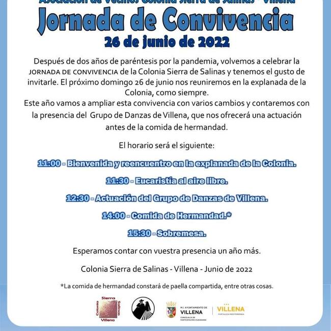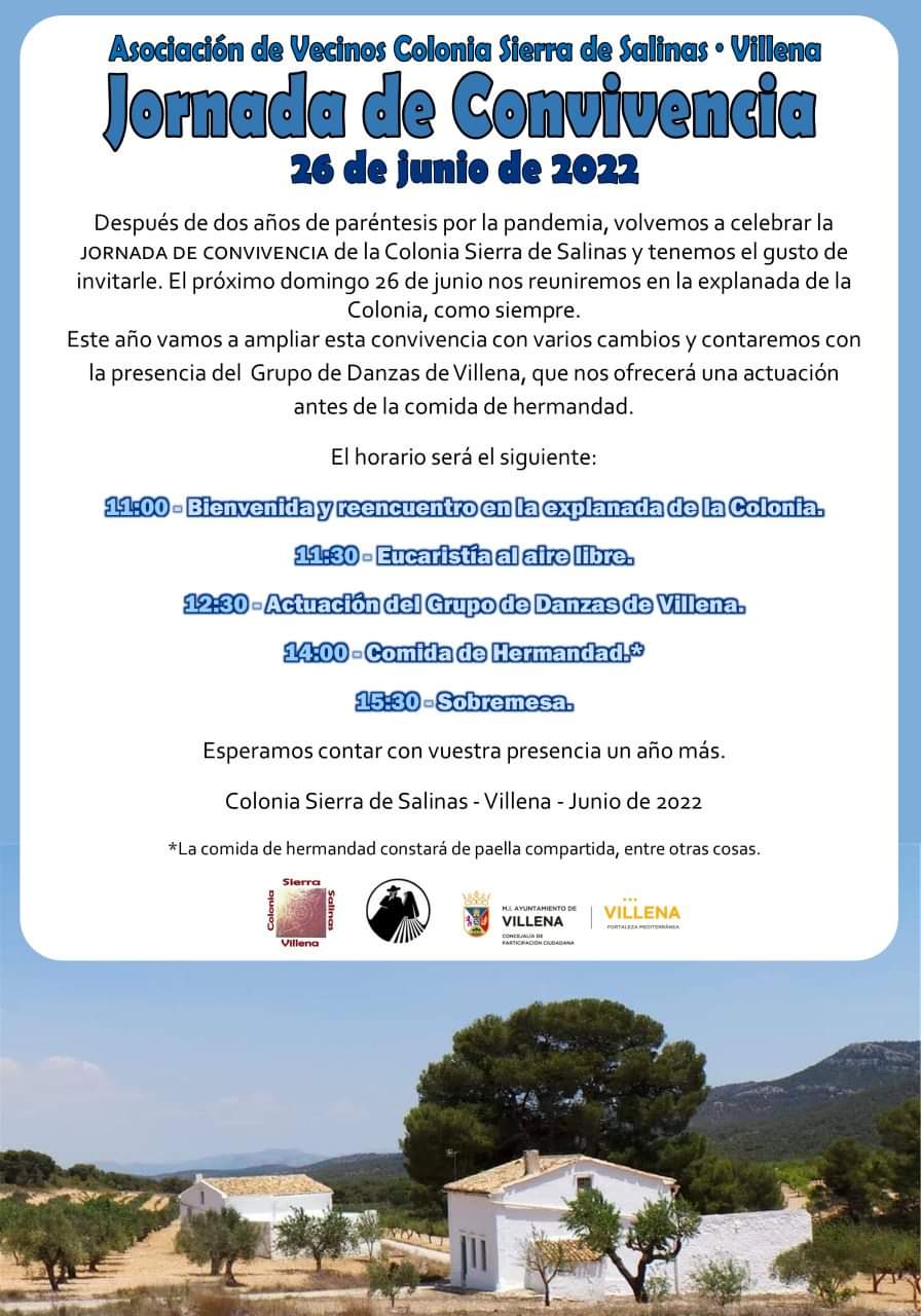 Después de dos años de paréntesis por la pandemia, los vecinos de la Sierra volverán a celebrar la tradicional Jornada de Convivencia en la Colonia de la Sierra de Salinas. El encuentro será en la explanada de la Colonia, como siempre, aunque ampliando la velada con varios cambios. Entre ellos, contando con la presencia de los mayores y jóvenes del Grupo de Danzas de Villena que ofrecerá una actuación antes de la comida de hermandad para los asistentes