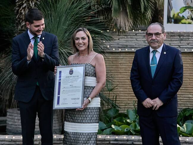 Eva Pellicer, junto al alcalde y el presidente de la Junta Mayor de Hermandades en el acto de su petición. / Natxo Francés