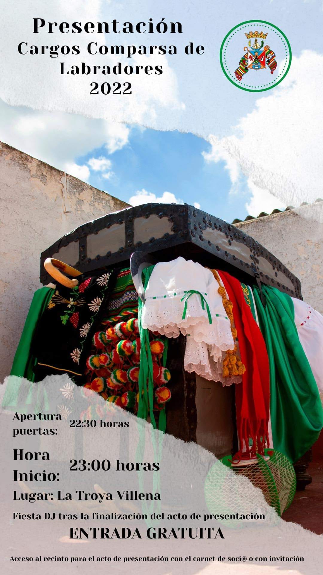 La entrada es gratuita, con el carnet de socio o invitación. A su término continuará la fiesta con un dj.