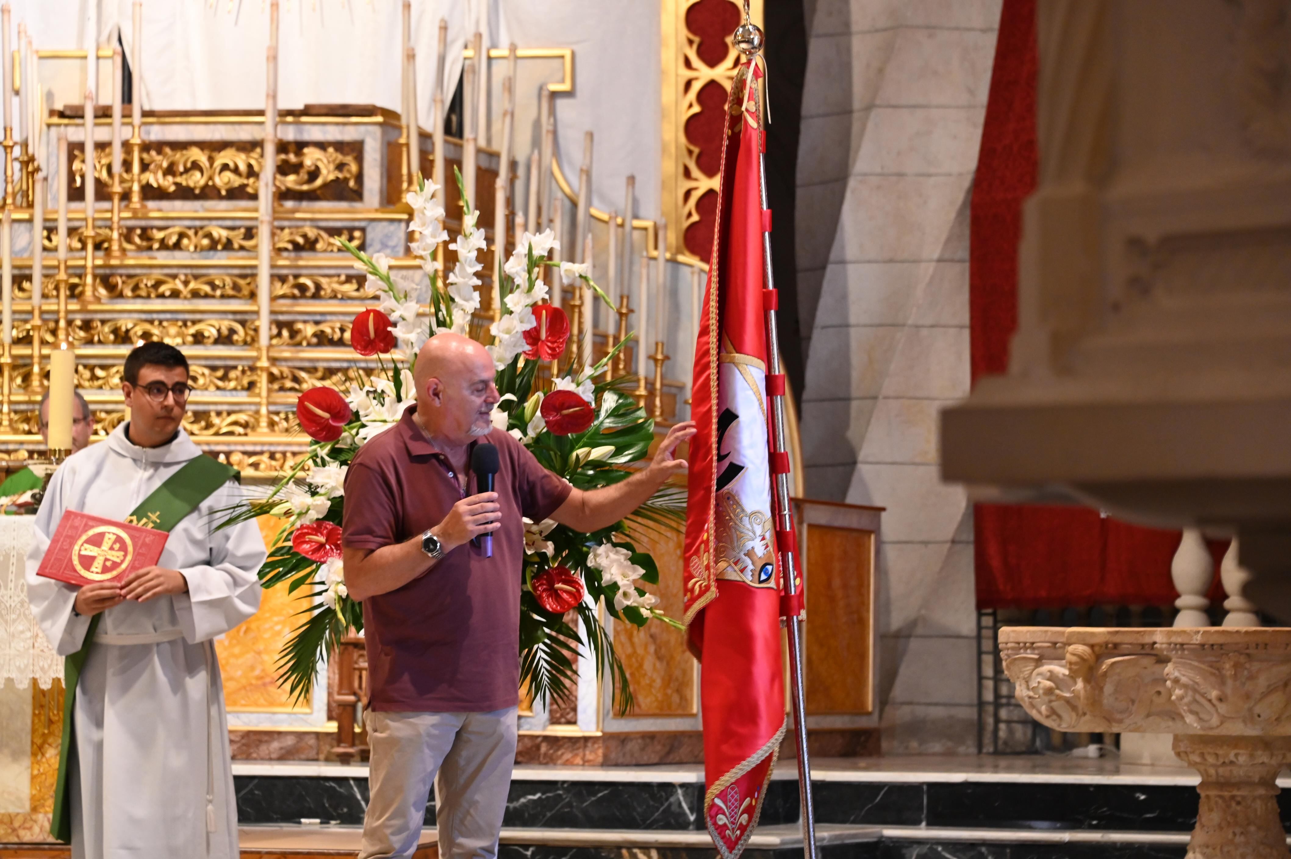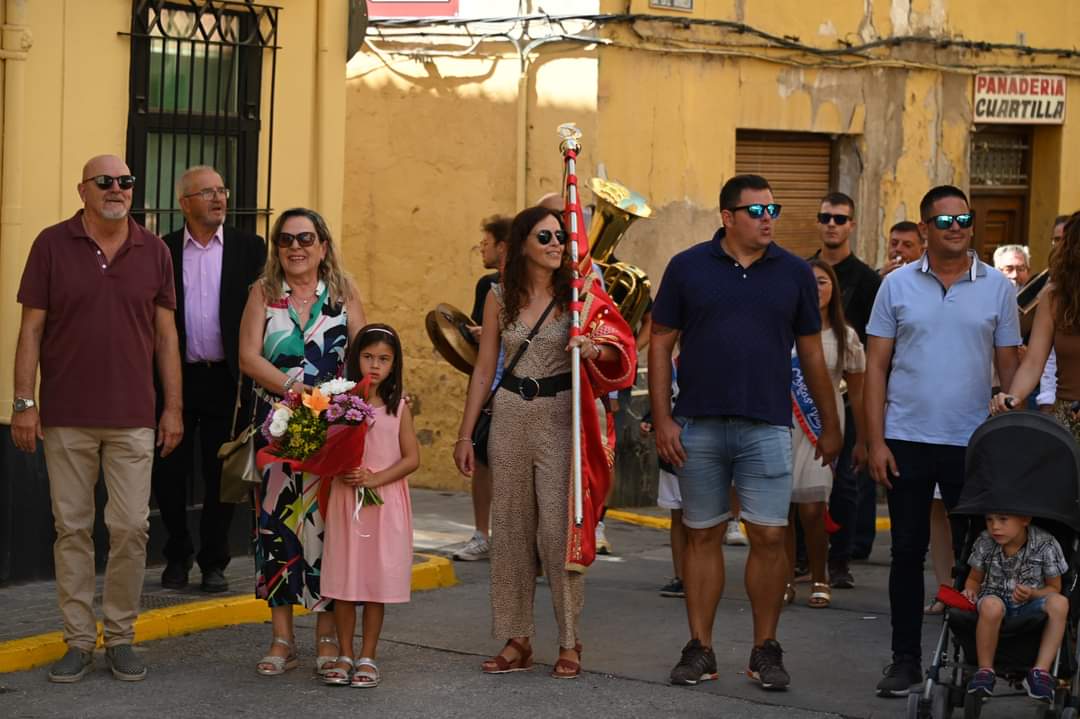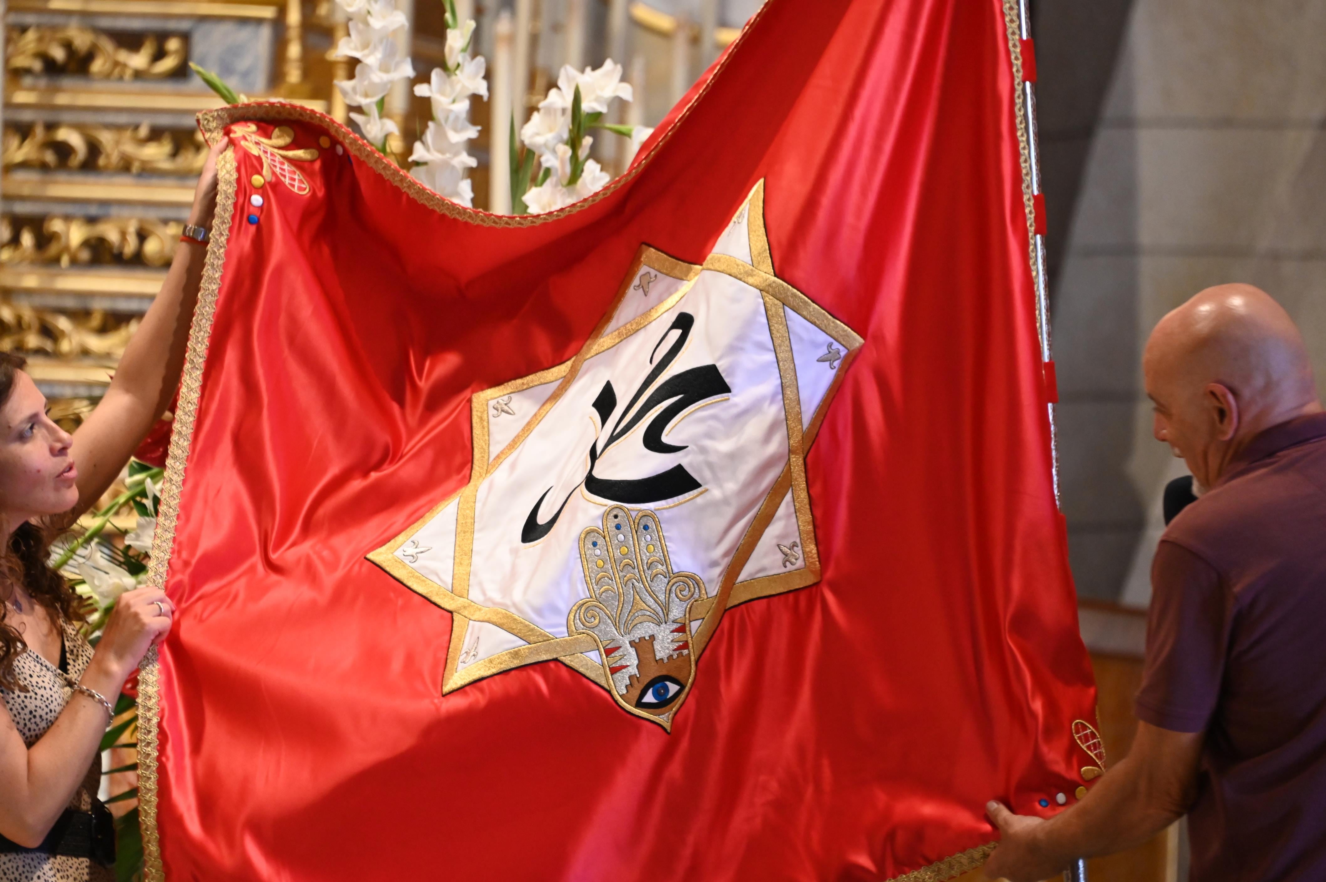La Comparsa de Moros Viejos ha vivido un domingo especial de agosto, en la antesala de las cada vez más próximas fiestas, con el acto de bendición de la nueva bandera, donada por la familia Navarro Muñoz