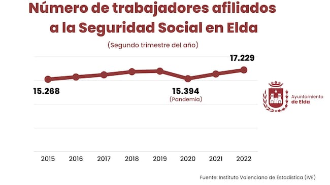 De la misma manera, el número de afiliaciones a la Seguridad Social también registra datos excelentes. En estos momentos, el número de personas afiliadas a la Seguridad Social en Elda se sitúa en 17.229, según los datos del segundo trimestre del año facilitados por el Instituto Valenciano de Estadística (IVE). Este dato supone un 5,20% más de afiliados que en el mismo periodo de 2021 y del 12% con respecto a 2020.