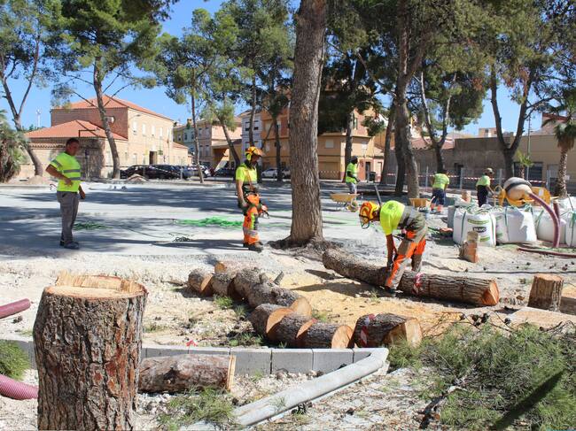 El Ayuntamiento de Novelda ha iniciado los trabajos de tala de siete de los pinos carrascos de la plaza de San Lázaro, una tarea recomendada por informe técnico externo solicitado a una empresa especializada en el marco del proyecto de remodelación del parque.