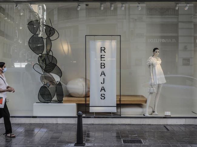 Una mujer protegida con mascarilla pasa al lado del escaparate de una tienda donde se observan carteles indicativos de rebajas en València / Rober Solsona (EUROPA PRESS)
