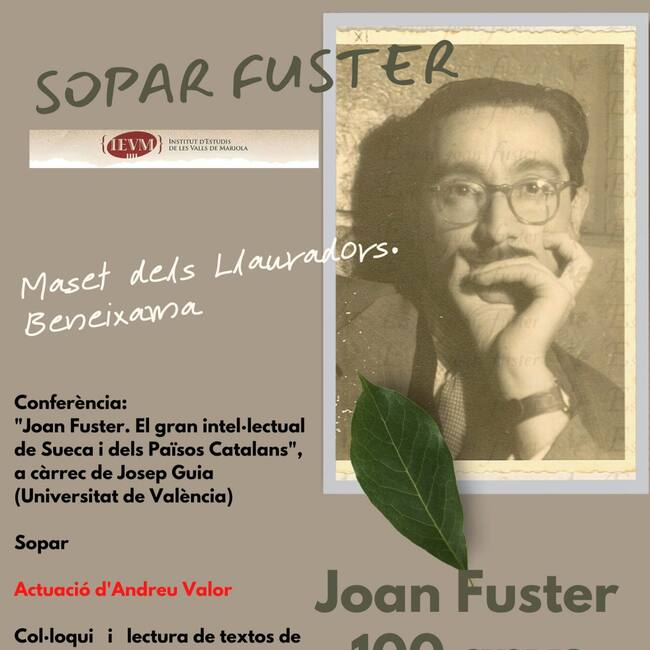 Bajo el nombre de “Sopar-Fuster”, este sábado a las 21 horas, el Centro Ovidi Montllor de Alcoi ha organizado, junto al Instituto de los Valles de Mariola una cena-conferencia en el Maset de la Comparsa de Llauradors, conmemorando el Año Fuster, figura de las letras, que escribió en castellano pero sobre todo en catalán, persona considerada como uno de las figuras clave del nacionalismo valenciano