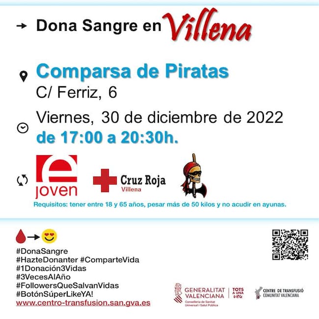 La Comparsa, en colaboración con el Espacio Joven, volverá a acoger a los sanitarios del Centro de transfusiones de la Consellería de Sanidad entre las 17 a 20.30 horas, invitando a toda la población mayor de edad, donantes habituales o no, a participar en esta causa solidaria