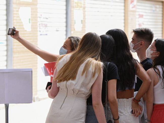 Varios jóvenes se hacen una autofoto tras vacunarse en València. / Getty