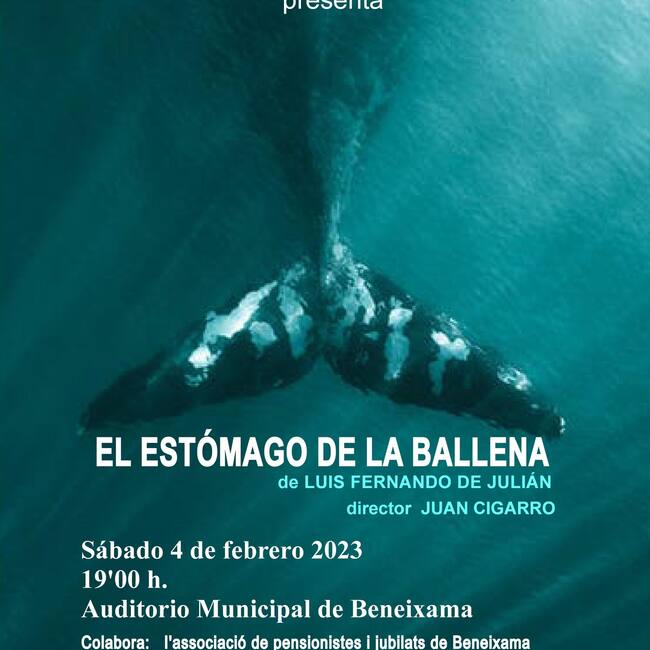 Caricato Teatro, de Villena, llevará su último montaje este sábado a Beneixama. A las 19 horas en el Auditorio Municipal se pondrá en escena la obra “El Estómago de la Ballena”, de Luis Fernando de Julián. El acto está organizado por la Asociación de Jubilados y Pensionistas en colaboración con el Ayuntamiento, con entrada libre