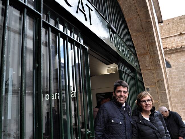 El presidente del PPCV, Carlos Mazón con la candidata del PP a la alcaldía de Xàbia, Rosa Cardona, a las puertas del Mercat Municipal. / PP Alicante