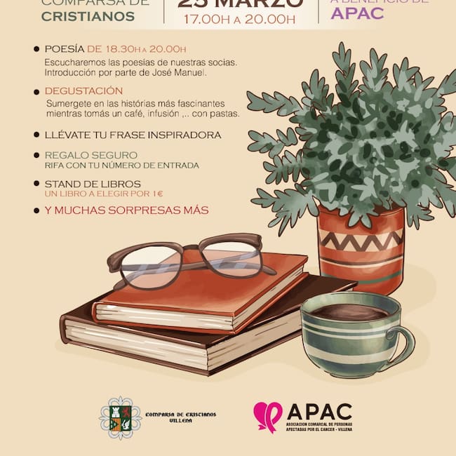 La Comparsa de Cristianos ha organizado para este sábado una velada literaria para colaborar con APAC (asociación personas afectadas por el cáncer), en su sede social de la Plaza mayor, que estará plagada de sorpresas y regalos. Con la entrada, habrá un detalle seguro.