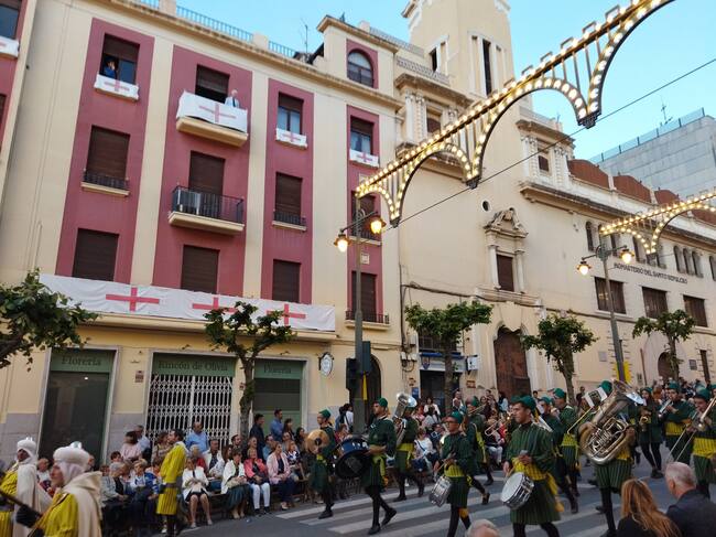 La banda Cercle Musical Primitiva d'Albaida El Gamell acompañando a los Abencerrajes en la procesión de San Jorge.