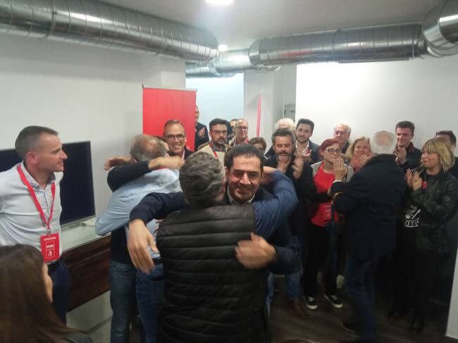 El candidato a la alcaldía de Alcoy por el PSOE, Toni Francés, se abraza en la sede del Partido Socialista en la ciudad