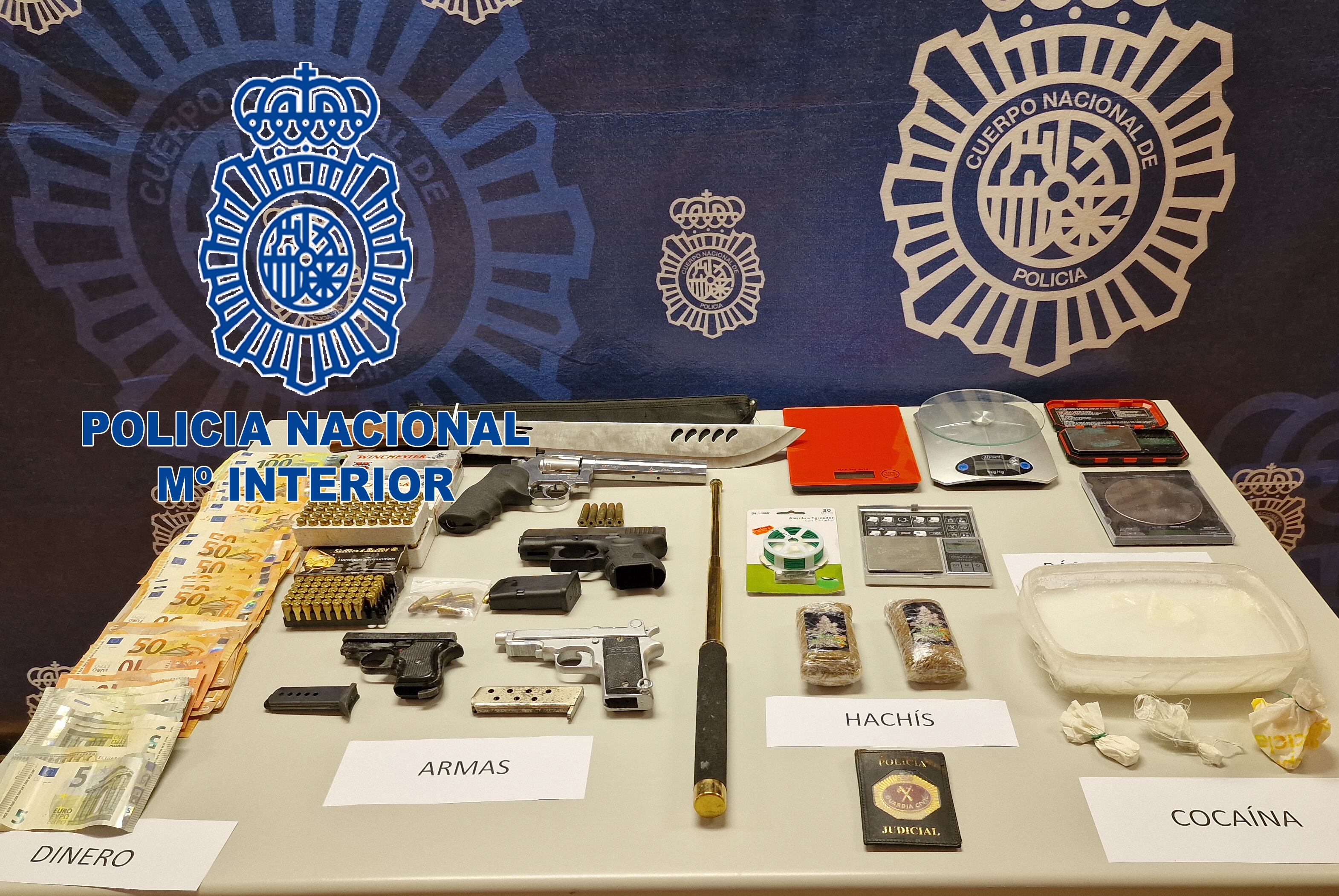 En cuanto al resultado de los registros practicados, entre las diferentes viviendas donde se actuó, se intervinieron 1.070,33 gramos de cocaína, 200 gramos de hachís, 6 Básculas de precisión junto con otros útiles destinados a la manipulación y venta de droga, 3 pistolas semiautomáticas, 1 revólver, 8.215 euros en efectivo y 8 vehículos de alta gama.
