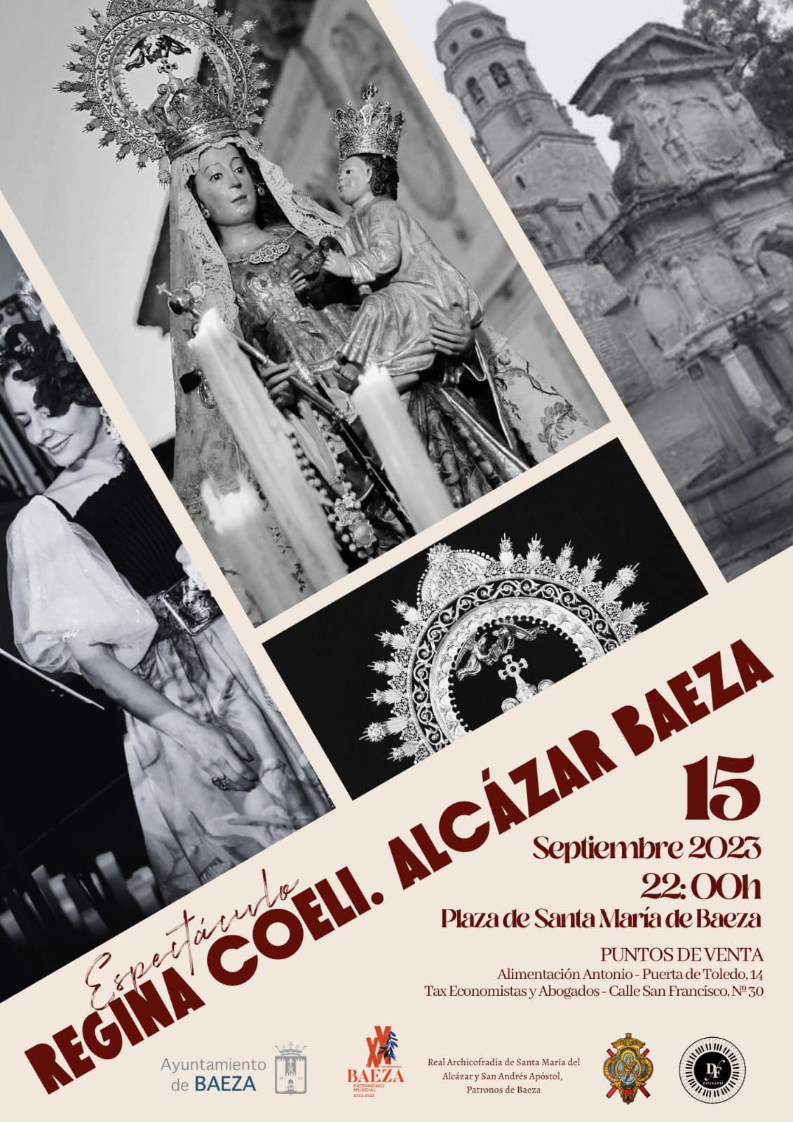 Bajo el título “Regina Coeli. Alcázar Baeza”, la plaza de Santa María vivirá un gran espectáculo musical en torno a la figura de Santa María del Alcázar, Patrona de Baeza el próximo 15 de septiembre. Se trata de una cita con cánticos de alabanza en un entorno de primer orden, que viene de la mano de la Asociación Diferarte, y que se llevará a cabo el 15 de septiembre a las 22.00 horas.