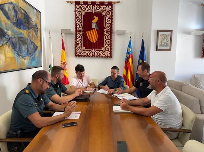 El alcalde de Canals, Nacho Mira, el teniente de alcalde, Edu Badal, y el concejal de Fira i Festes, Javier Catalá, se han reunido este miércoles con las fuerzas de seguridad del pueblo para preparar la vigilancia durante las celebraciones de la Feria de Septiembre.