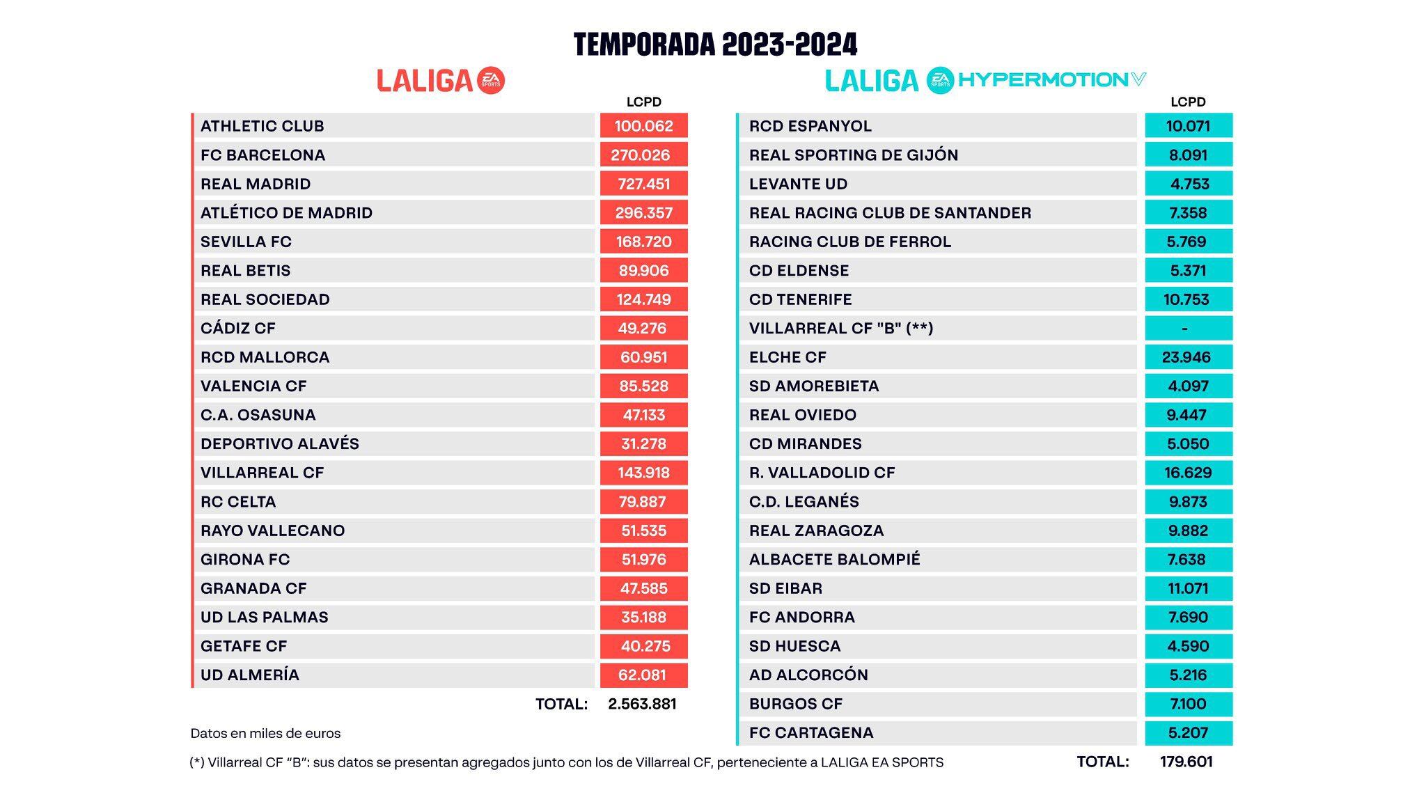 La Liga ha hecho público el Límite de Coste de Plantilla Deportiva (LCPD) de los clubes de la Primera y Segunda División tras el cierre del mercado de verano. Se trata del conocido límite salarial que hace referencia a la cantidad que cada club puede gastar como máximo en su plantilla en función de sus ingresos y sus gastos.
