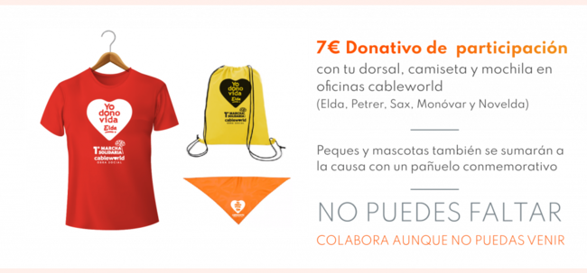 El próximo 1 de octubre tendrá lugar la 1ª Marcha solidaria de la Obre Social Cableworld en la vecina localidad de Elda, partiendo desde la Plaza Sagasta a las 11 de la mañana. Para participar en ella, solo hay que inscribirse en las oficinal Cableworld, donde se hará entrega del Kit de la marcha.