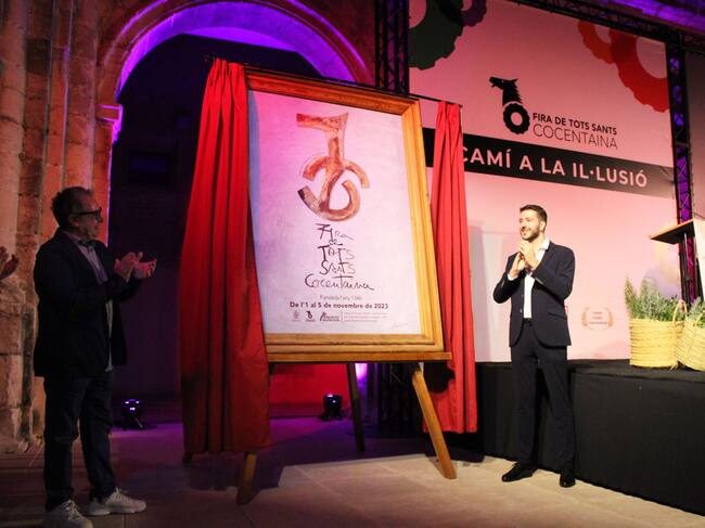 El escultor Moisés Gil y el alcalde Jordi Pla tras descubrir el cartel que anuncia la Fira de Tots Sants de Cocentaina 2023. / Radio Alcoy