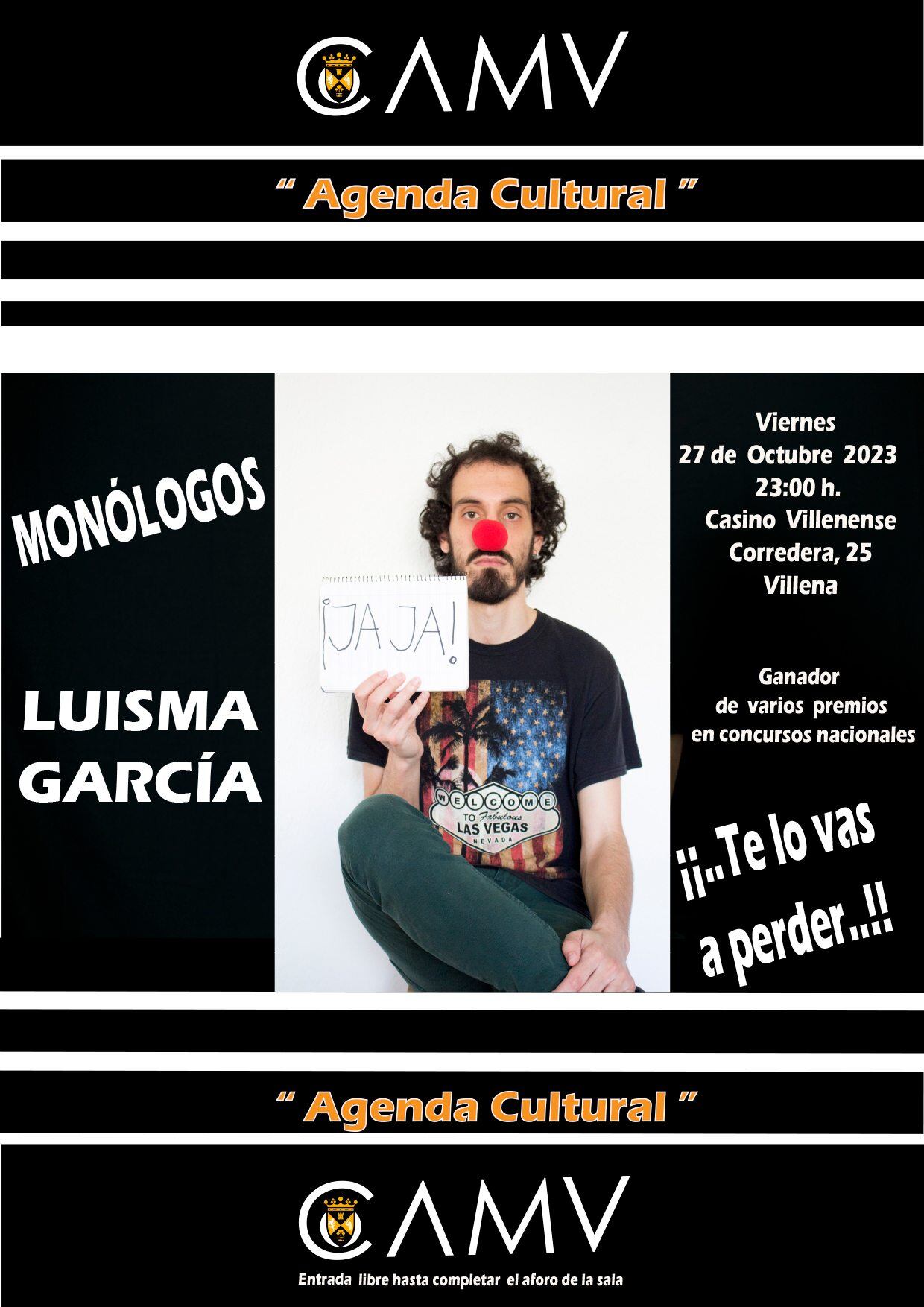 Ignacio Cano Chaumel y Jose Carlos Payá nos han avanzado las actividades que el Círculo Agrícola Mercantil Villenense pone en marcha desde este viernes, con el monólogo de Luisma García, un monologuista que ya visitó Villena para participar en el concurso de monólogos del Rabal y que ahora vuelve al Casino del Círculo para hacernos pasar una magnífica velada, este viernes 27 de octubre, a partir de las 23:00 horas.