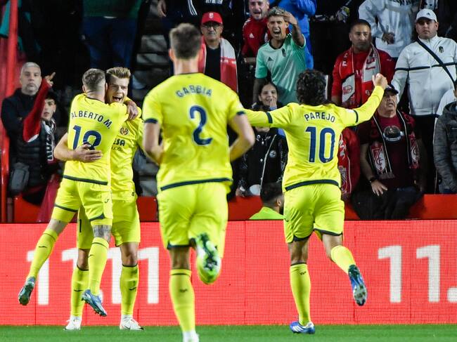 GRANADA, 30/10/2023.- Los jugadores del Villarreal celebran el tercer gol del equipo castellonense durante el encuentro correspondiente a la jornada 11 de primera división que disputan hoy lunes frente al Granada en el estadio Nuevo Los Carmenes de Granada. EFE / Miguel Ángel Molina. / MIGUEL ÁNGEL MOLINA (EFE)