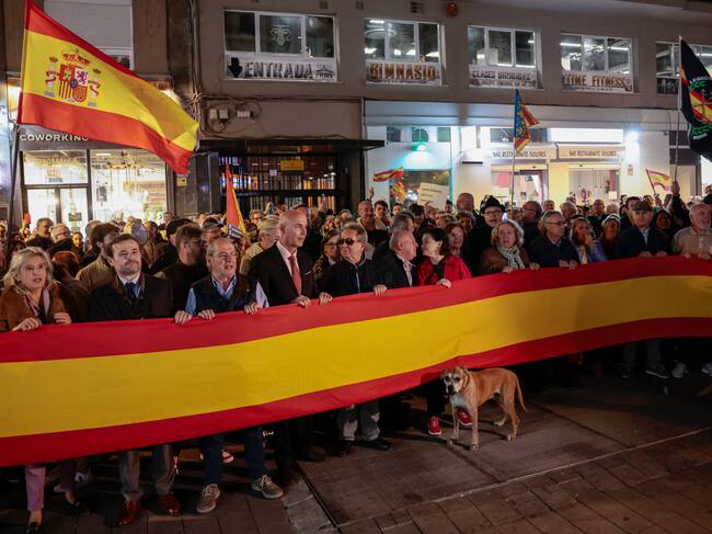 GRAFCVA6642. VALENCIA, 06/11/2023.- Concentracion este lunes frente a la sede del PSPV-PSOE en Valencia contra los pactos de investidura del presidente en funciones, Pedro Sánchez, que incluyen una ley de amnistía. EFE/Ana Escobar / Ana Escobar (EFE)