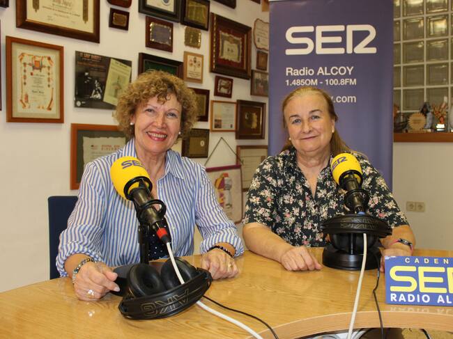 Juana Plaza i Toya Sandoval, dos de les fundadores del Grup de Danses Carrascal, en l'estudi central de Radio Alcoy en una imatge d'arxiu