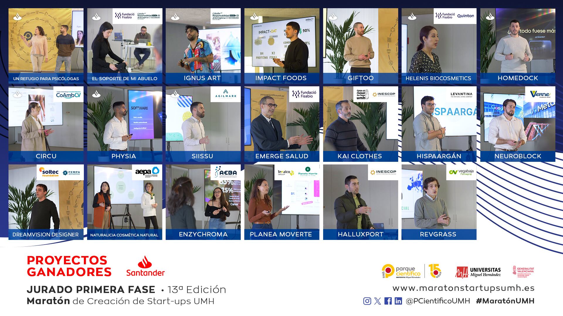 El Parque Científico de la Universidad Miguel Hernández (PCUMH) de Elche ha dado a conocer hoy miércoles, 24 de enero, el nombre de los proyectos ganadores de la primera fase de la 13ª Maratón de Creación de Start-ups UMH. En este sentido, los proyectos “Un refugio para psicólogas”, “El soporte de mi abuelo”, “Helenis Biocosmetics”, “Ignus Art”, “Impact Foods”, “Giftoo”, “HomeDock”, “Circu”, “Physia” y “Siissu” han recibido un total de 1.000 euros cada uno patrocinados por Banco Santander. La presentación de los finalistas ante el jurado tuvo lugar ayer martes, 23 de enero.