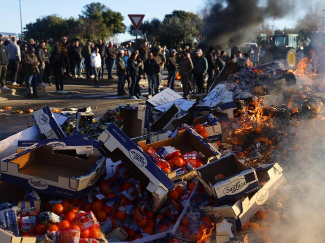 Agricultores franceses queman frutas españolas durante una manifestación en la que han bloqueado la autopista A9 en Nîmes, en el sur de Francia. / GUILLAUME HORCAJUELO (EFE)