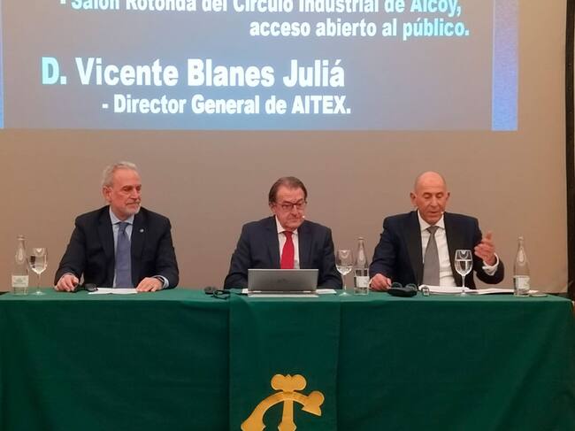 El director general de AITEX, Vicente Blanes, ha sido el ponente en esta ocasión de una nueva conferencia-coloquio que ha tenido lugar en el Salón Rotonda del Circulo Industrial de Alcoy dentro del ciclo 'Alcoy mirando al futuro', en su tercera edición, actividad organizada por Rafael Valls, quien ejerce de coordinador, presentador y moderador.