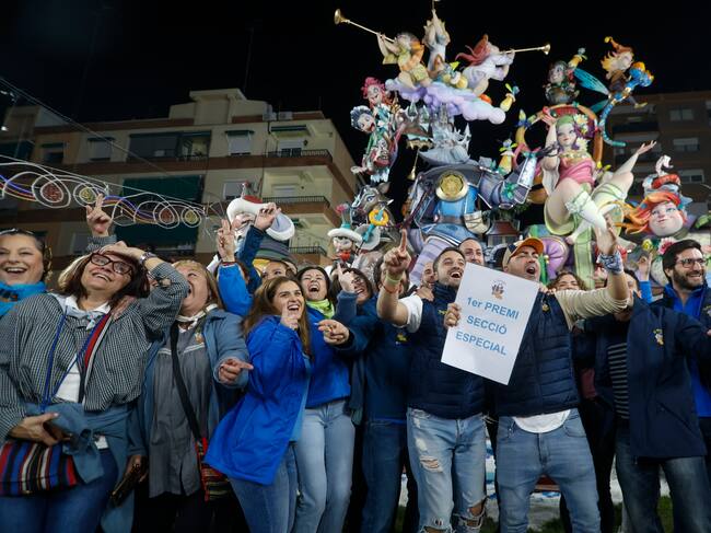GRAFCVA9292. VALENCIA, 16/03/2024.- Miembros de la falla Monestir de Poblet-Aparicio Albiñana (L'Antiga de Campanar), realizada por el artista Josué Beitía, celebran haber conseguido el primer premio de la Sección Especial de las Fallas de València con el monumento "Canvi climàtic". EFE/Miguel Ángel Polo / Miguel Ángel Polo (EFE)