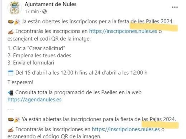 Lo ha anunciado con una publicación que ha llamado la atención de los vecinos al detectar que desde el consistorio se invita a la "festa de les palles", que más abajo aparece también traducido al castellano como la "fiesta de las pajas".