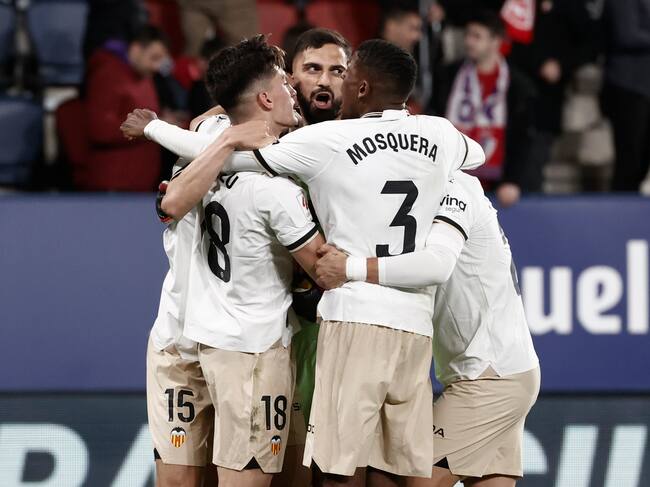 PAMPLONA, 15/04/2024.- Los jugadores del Valencia celebran la victoria ante Osasuna, al término del partido de LaLiga en Primera División que CA Osasuna y Valencia CF han disputado este lunes en el estadio de El Sadar, en Pamplona. EFE/Jesús Diges / Jesús Diges (EFE)