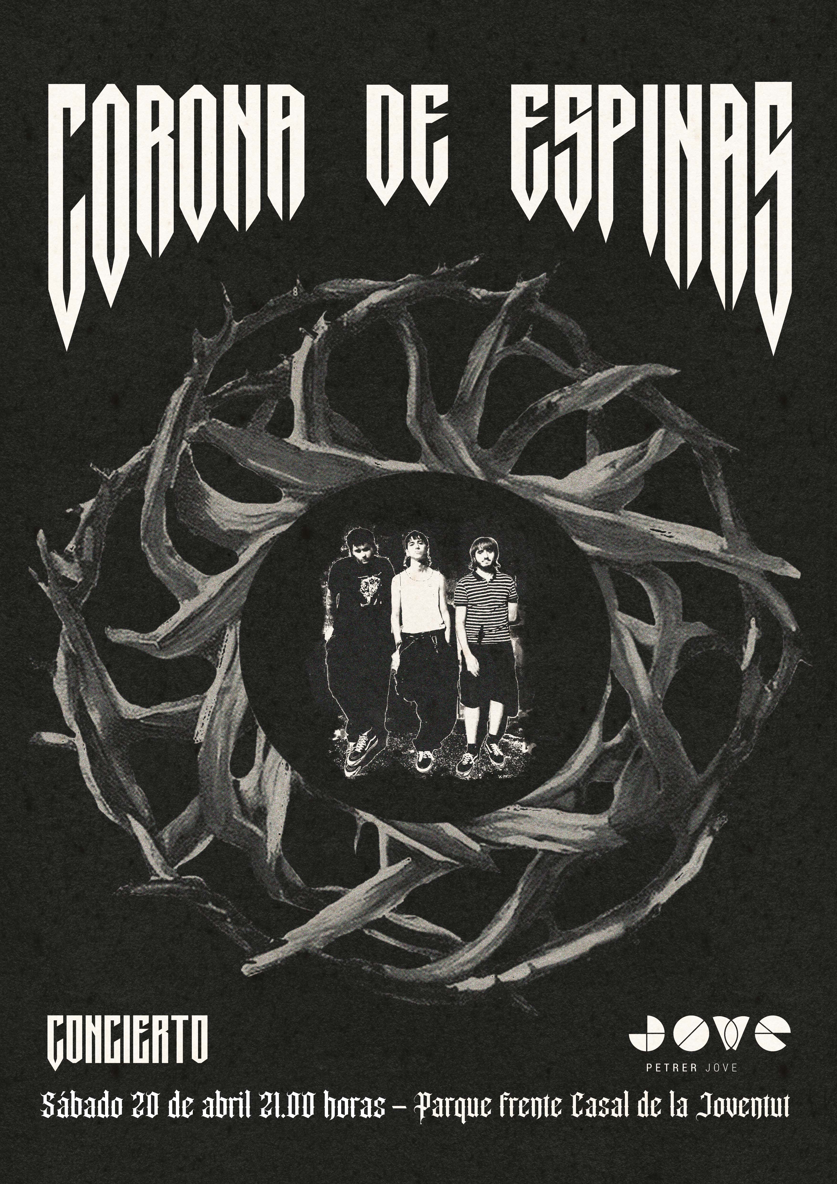 Corona de Espinas es un grupo formado en septiembre de 2022 por tres amigos de Petrer: Izán Cerdán (voz principal), su hermano Aarón Cerdán (guitarra) y Bruno Gutiérrez (bajo y coros). Su música bebe de géneros como el dark-wave, el synth-wave o el post-punk, inspirándose en grupos como Siouxsie & The Banshees, The Cure, Bauhaus, Joy Division y muchos otros. Además, todas las canciones de la banda son complementadas con sonidos que producen ellos mismos. Su pasión por la música es una plataforma para hacerse eco de las injusticias sociales y políticas que observan a su alrededor.