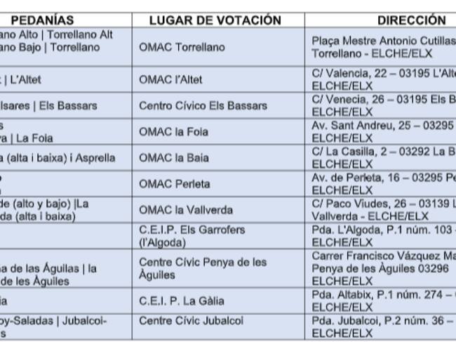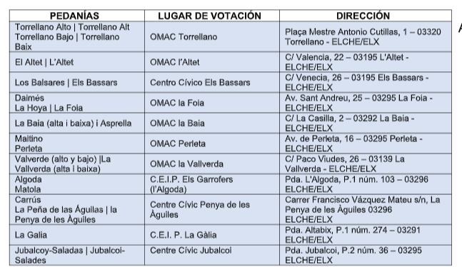 El Ayuntamiento de Elche ha habilitado diferentes espacios municipales en algunas pedanías para llevar a cabo la votación: