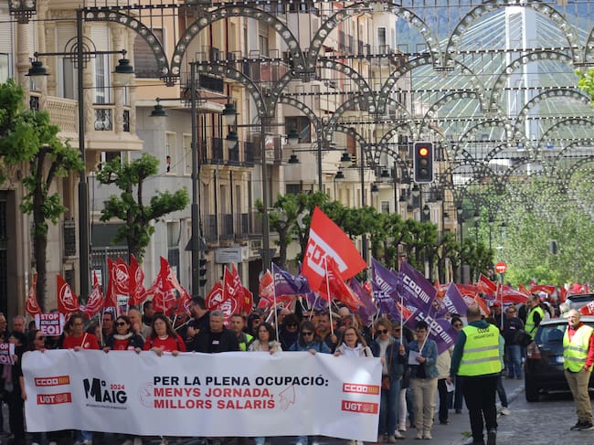 La que encabezaba esta manifestación tenía este año como lema 'Per la plena ocupació: menys jornada, millors salaris', mientras que había una segunda pancarta que reflejaba esta petición: 'Los trabajadores y trabajadoras de la industria, por un convenio digno'.