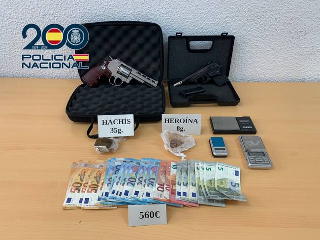 Finalmente, se han incautado un total de 7,5 kilos de polen de hachís, más de 850 gramos de hachís, 14 gramos de cocaína, ocho de heroína, 560 euros en efectivo, seis básculas de precisión así como dos armas de fuego.