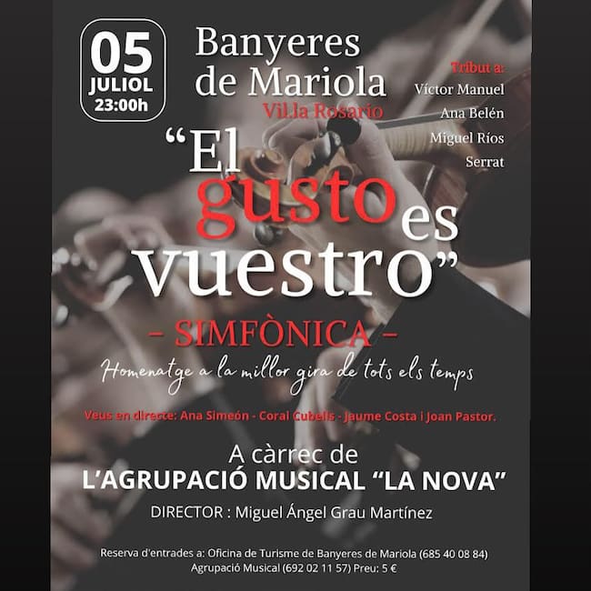 Los actos siguen el viernes. A las 23 horas y en el parque municipal Villa Rosario, la Agrupació Musical “La Nova” ofrecerá su concierto de verano, que hará un tributo a los grandes éxitos de Víctor Manuel, Ana Belén, Miguel Rios y Joan Manuel Serrat. La retirada de invitaciones se puede realizar en la oficina de turismo al precio de 5 euros