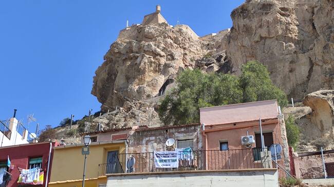 Casas a los pies de la Cara del Moro en el monte Benacantil de Alicante y un cartel contra los pisos turísticos ilegales / Omar Sancho Maestre
