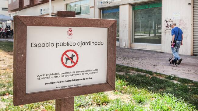 En los últimos días el Ayuntamiento de Elda ha puesto en los jardines de la localidad carteles en los que se prohíbe el paseo de perros. El incumplimiento de esta norma conlleva una multa de 601€.
