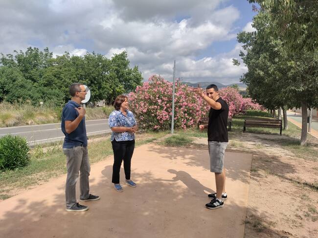 Sayo Gandia i els germans Mollà al punt on se situarà l'escultura homenatge a Sabateta