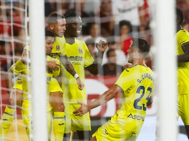 SEVILLA, 23/08/2024.- Los jugadores del Villarreal celebran el segundo gol, durante el partido de LaLiga que Sevilla FC y Villarreal CF han disputado este viernes en el estadio Ramón Sánchez-Pizjuán. EFE/José Manuel Vidal / José Manuel Vidal (EFE)