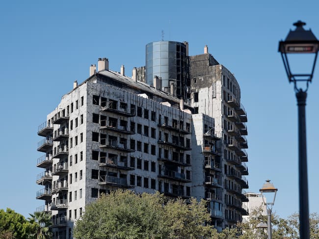 GRAFCVA2900. VALENCIA, 16/09/2024.- Vista general del edificio ubicado en el número 2 de la calle Poeta Rafael Alberti de València, en el barrio valenciano de Campanar, donde el pasado 2 de septiembre comenzaron oficialmente las labores de desescombro del bloque residencial que fue devorado por las llamas hace seis meses, como paso previo a la futura reconstrucción del inmueble, ya que no hay daños en la estructura que impidan rehabilitarlo. EFE/Kai Försterling / Kai Försterling (EFE)