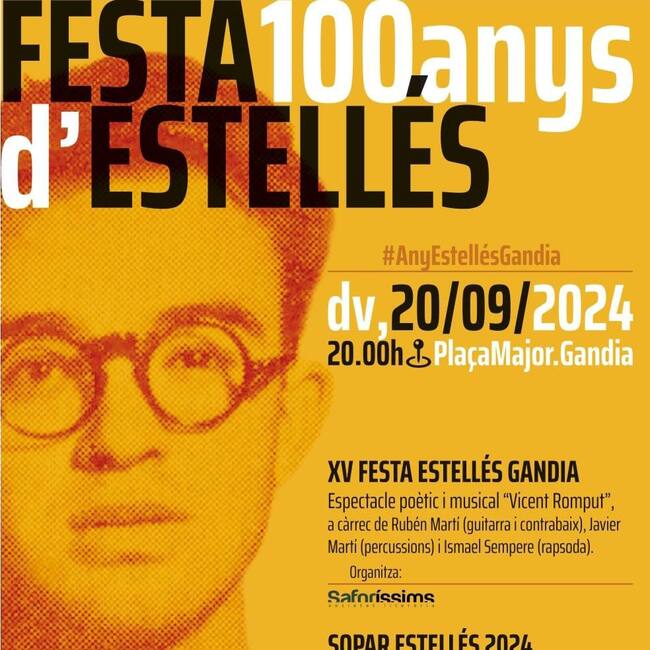 Siguiendo con las actividades conmemorativas este viernes se celebra la “Festa 100 anys d’Estellés”, organizada en colaboración con Saforíssims Societat Literària, la Fundación Casal Jaume I de la Safor-Valldigna y la coordinadora Safor-Valldigna pel valencià d’Escola Valenciana. Y este año se han querido unir las dos celebraciones tradicionales que normalmente se realizan en homenaje al poeta: un recital y una cena popular.