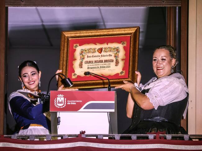 Carmen Beamud, presidenta de la Falla Estación, ha sido la encargada de pregonar las Fallas de Elda 2024 desde el balcón del Ayuntamiento delante de toda la ciudad. Andrea y Carmen Beamud, sus dos hijas, han sido las encargadas de presentar a la pregonera con un emotivo discurso donde han enfatizado la trayectoria de su madre en la fiesta del fuego.