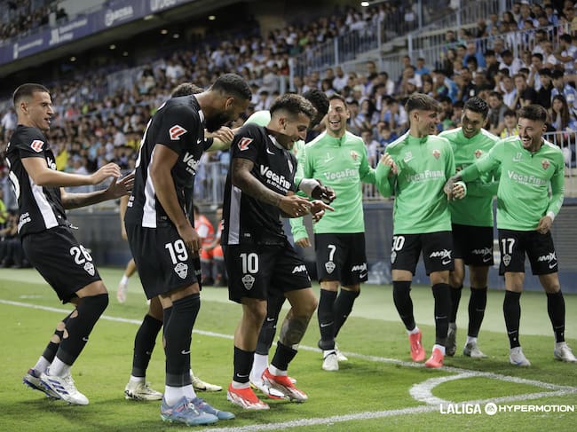 Los jugadores del Elche celebran el golazo de Nico Fernández Mercáu en Málaga / ELCHE CF