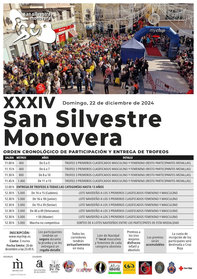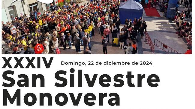 La concejalía de Deportes de Monóvar junto con distintos clubes deportivos de la localidad, además de Policía Local, Protección Civil y Cruz Roja, organiza la tradicional San Silvestre Monovera que, en su trigesimotercera edición, se celebrará el 22 de diciembre de este año.